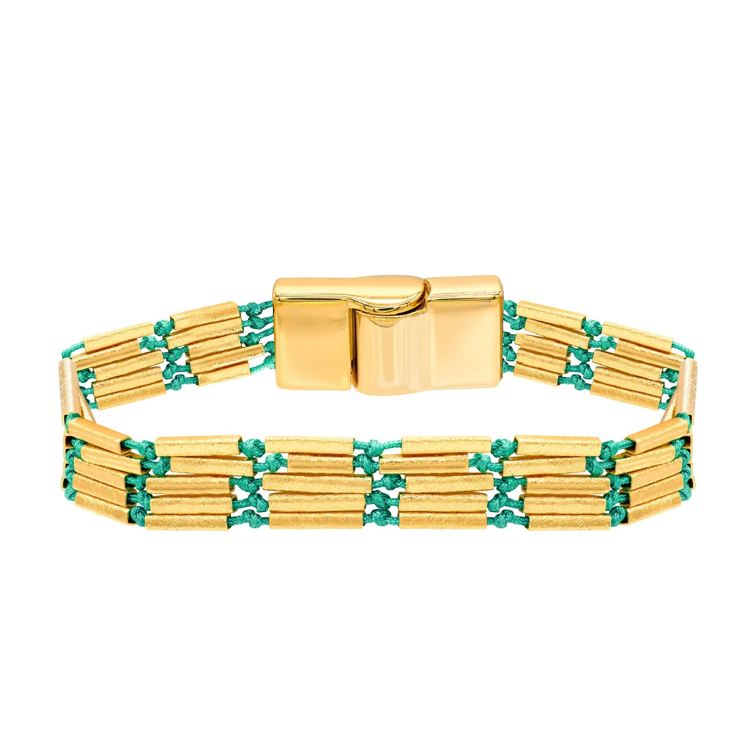 18k gold plated cylinder beaded multi strand bracelet strung together with colored string. Measures 6" with a magnetic closure.