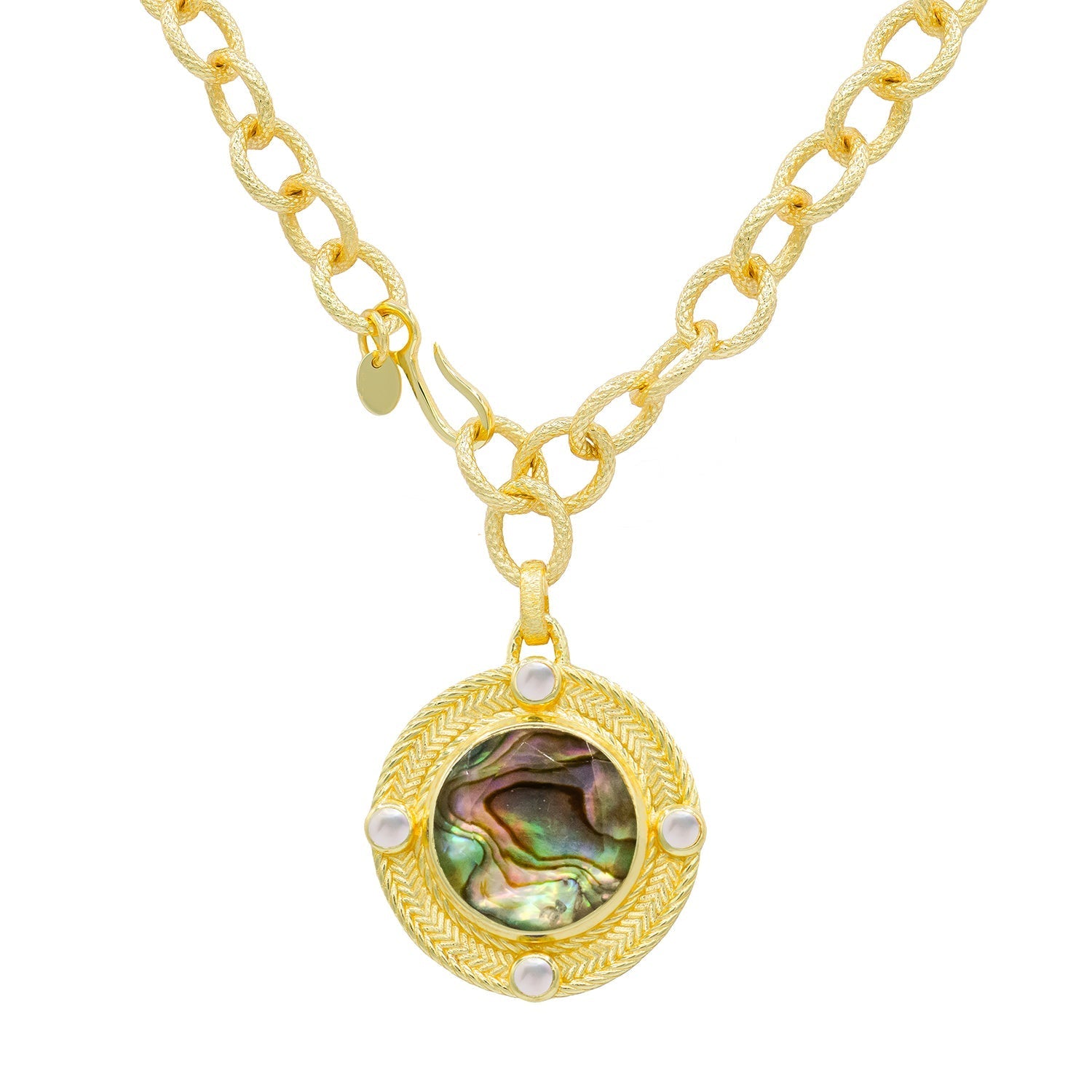 This exquisite 18k gold plated necklace features 18 inches handmade organic chain and a striking large round medallion with a choice of captivating stones. Each stone adds a unique touch of elegance, making it a versatile accessory for any occasion.