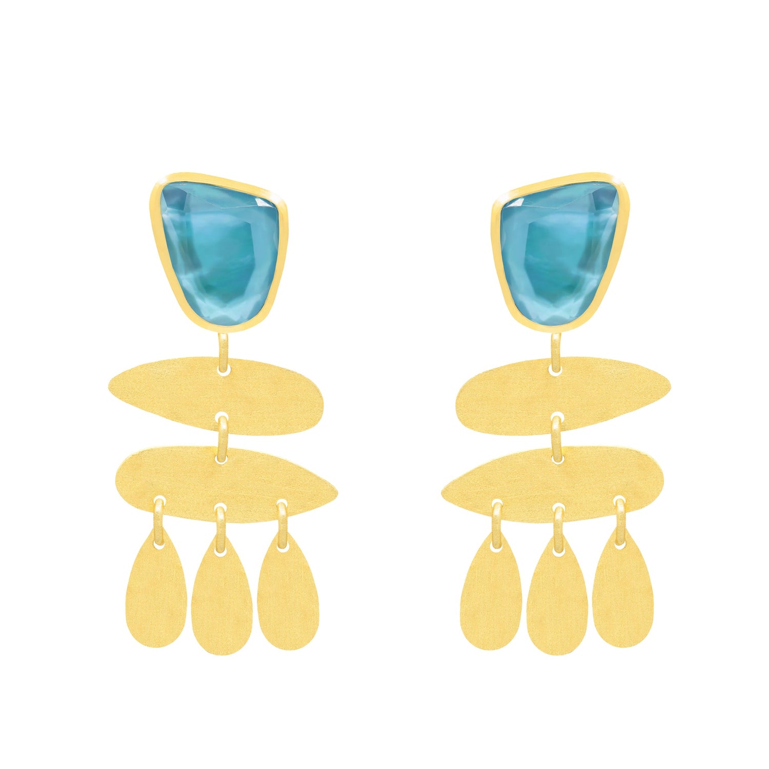 18k gold plated earrings with stone stud and cascading shapes. Measures 2" long