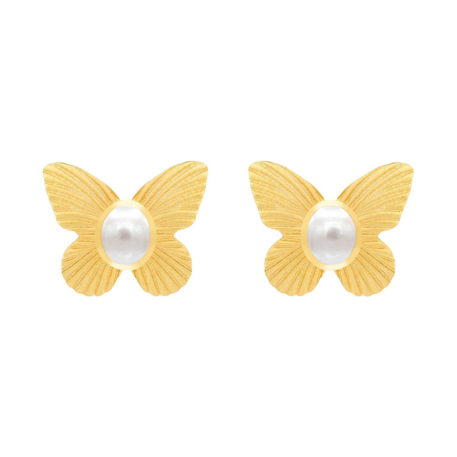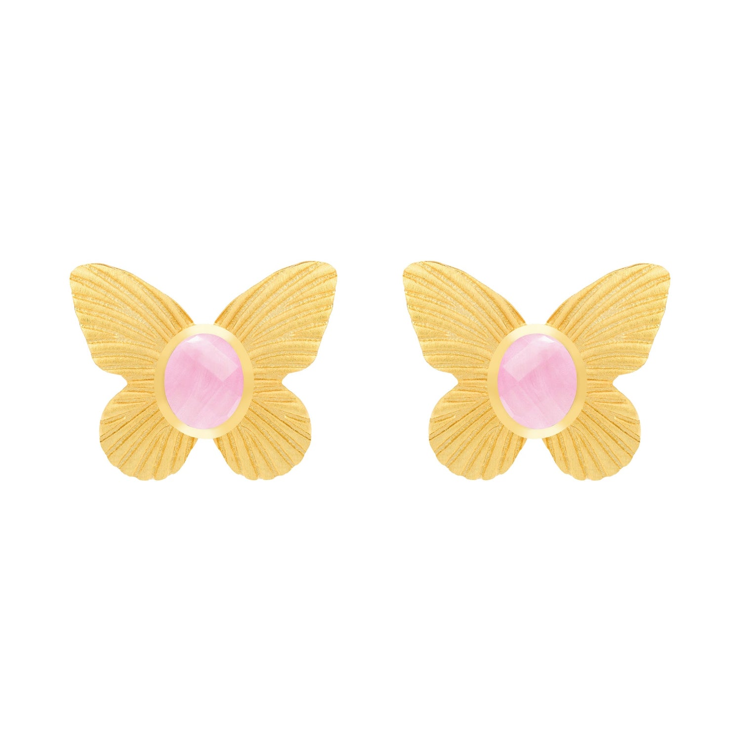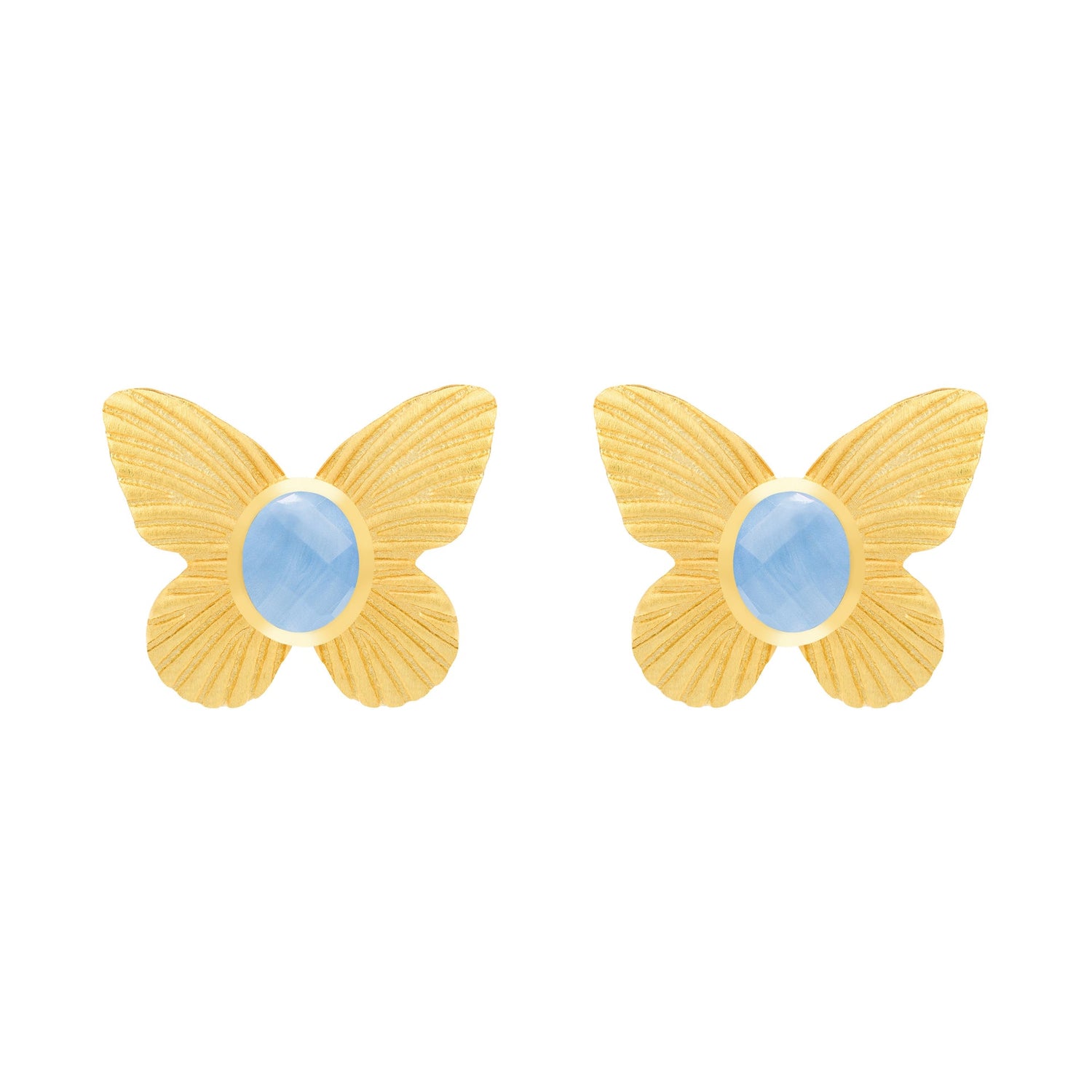18k gold plated butterfly studs with a stone in the center. Measures .5" wide.