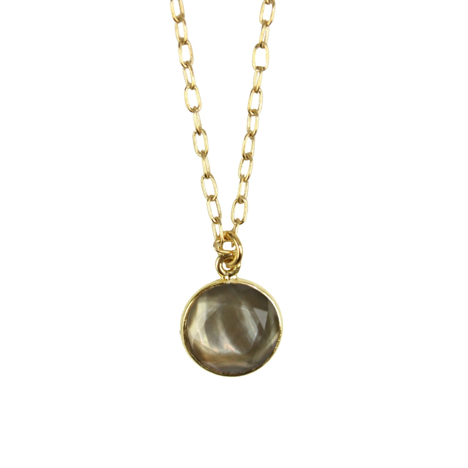 This 18k gold round pendant features semi-precious stones and hangs from an adjustable chain that ranges from 16 to 18 inches. The pendant measures 1/2 inch, offering a subtle yet elegant touch that’s perfect for layering or wearing on its own.